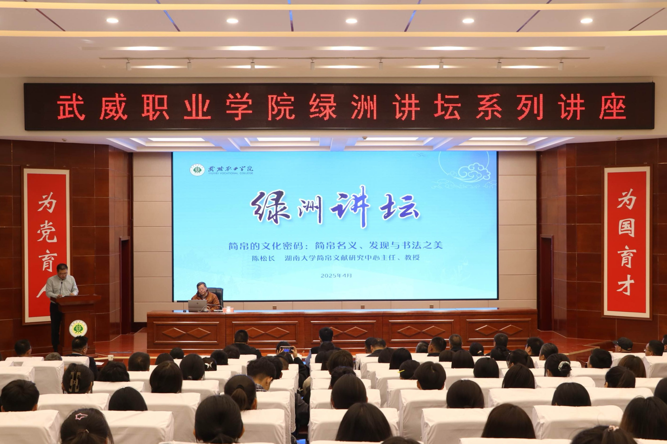 為豐富師生學(xué)術(shù)視野,深入探究歷史文化的獨(dú)特魅力,4月15日,學(xué)校特邀湖南大學(xué)岳麓書院教授、博士生導(dǎo)師、湖南大學(xué)簡(jiǎn)帛文獻(xiàn)研究中心和中國簡(jiǎn)帛書法藝術(shù)研究中心主任陳松長(zhǎng)教授,在菁英廳作了“簡(jiǎn)帛的文化密碼:簡(jiǎn)帛名義、發(fā)現(xiàn)與書法之美”專題講座。校長(zhǎng)李海軍主持講座,湖南大學(xué)師生代表、武威市涼州文化研究院研究人員、學(xué)校師生代表、媒體記者共210余人參加。