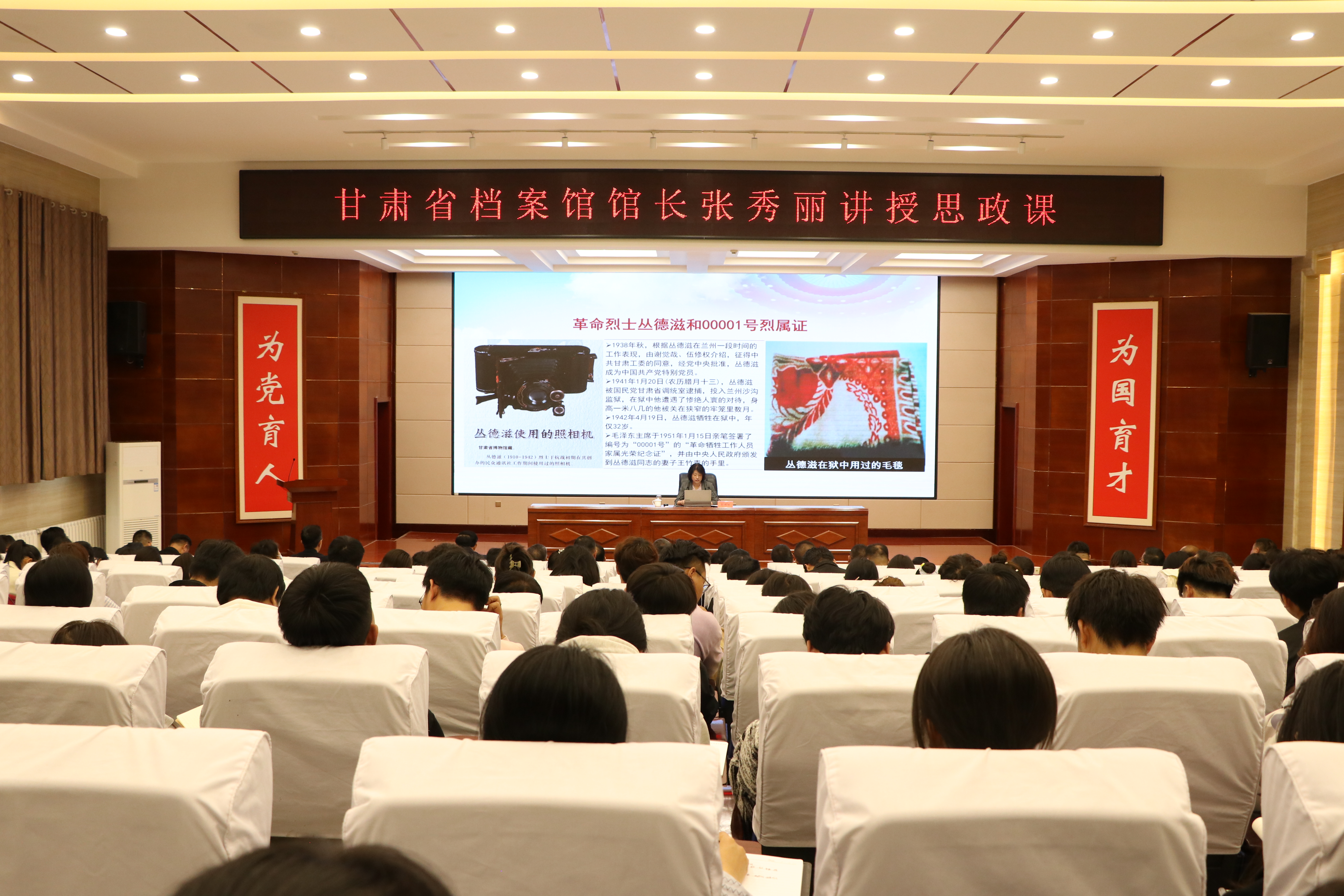 張秀麗結(jié)合自身從事檔案管理和文化研究的豐富經(jīng)驗(yàn),從檔案“存史、資政、育人”根本任務(wù)出發(fā),通過大量珍貴檔案文獻(xiàn)和歷史案例,系統(tǒng)闡述了檔案在記錄民族苦難輝煌、服務(wù)當(dāng)代治國理政、培育時(shí)代新人中的重要作用。報(bào)告中,她以館藏漢代簡牘、革命烈士叢德滋00001號(hào)烈屬證、民勤治沙檔案、甘肅地震檔案等一批具有歷史代表性和地域特色的檔案為載體,帶領(lǐng)師生穿越時(shí)空,感受中華民族生生不息的精神力量,深刻解讀“勿忘昨天的苦難輝煌,無愧今天的使命擔(dān)當(dāng),不負(fù)明天的偉大夢想”的時(shí)代內(nèi)涵。