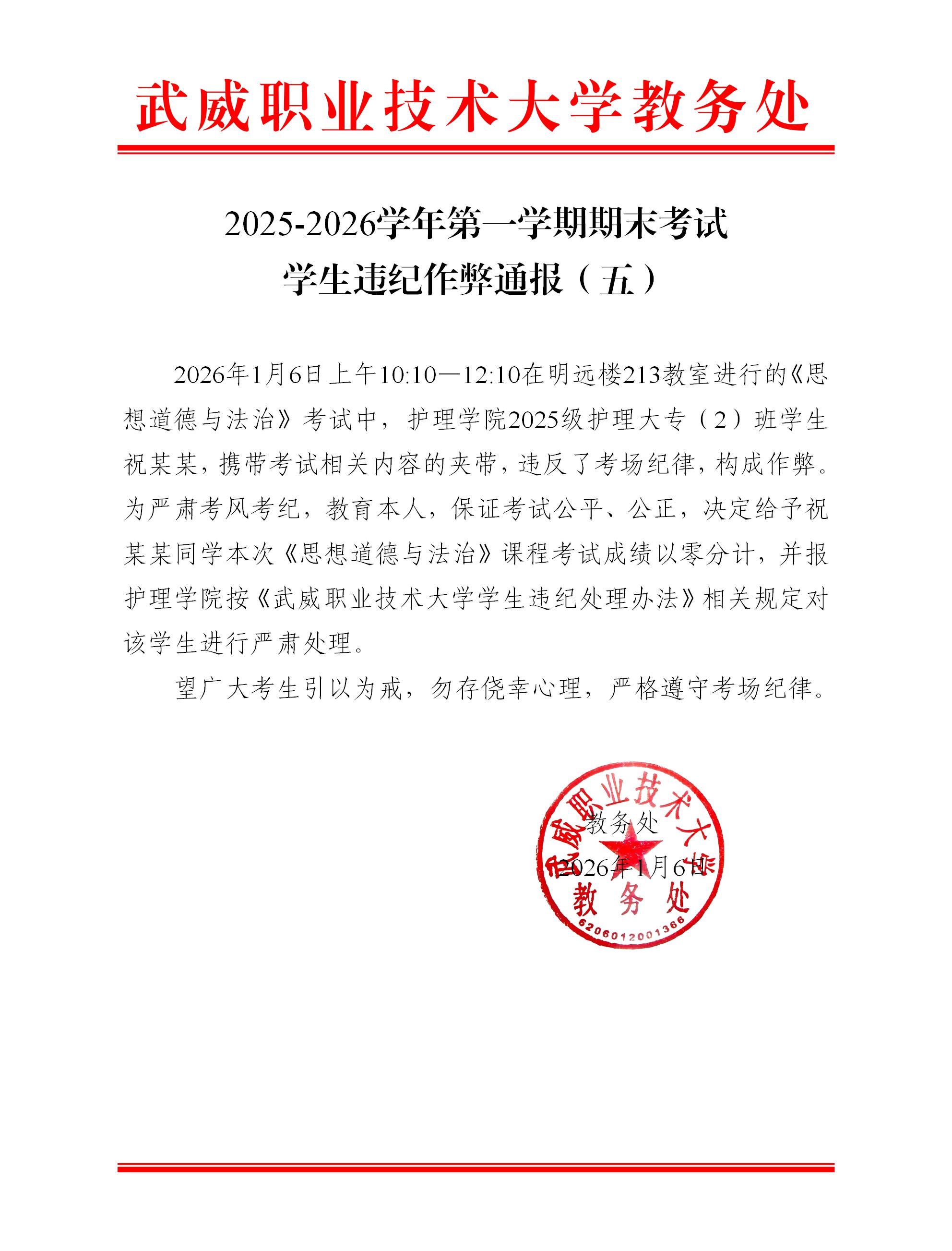 2025-2026學(xué)年第一學(xué)期期末考試學(xué)生違紀作弊通報(五)