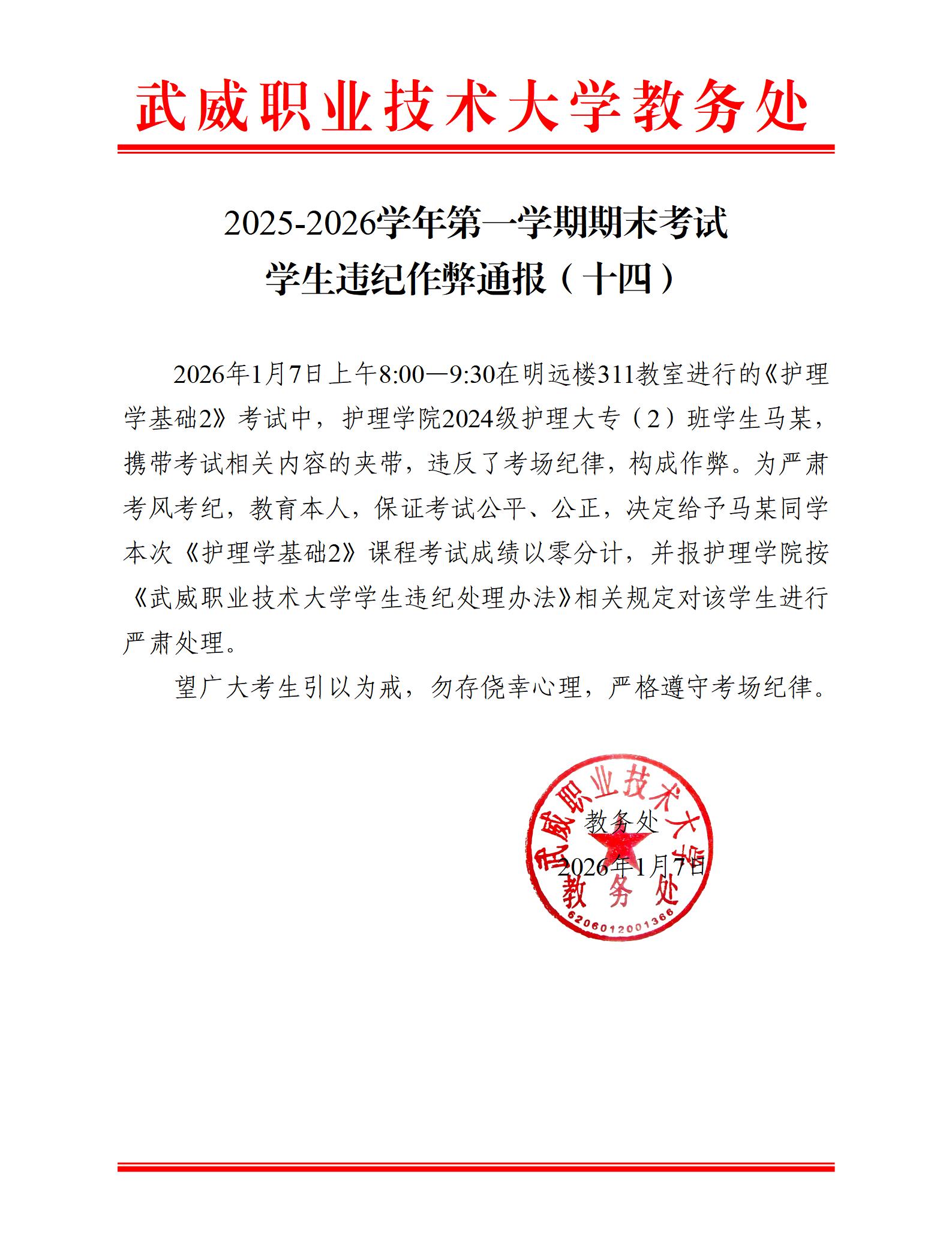 2025-2026學年第一學期期末考試學生違紀作弊通報(十四)