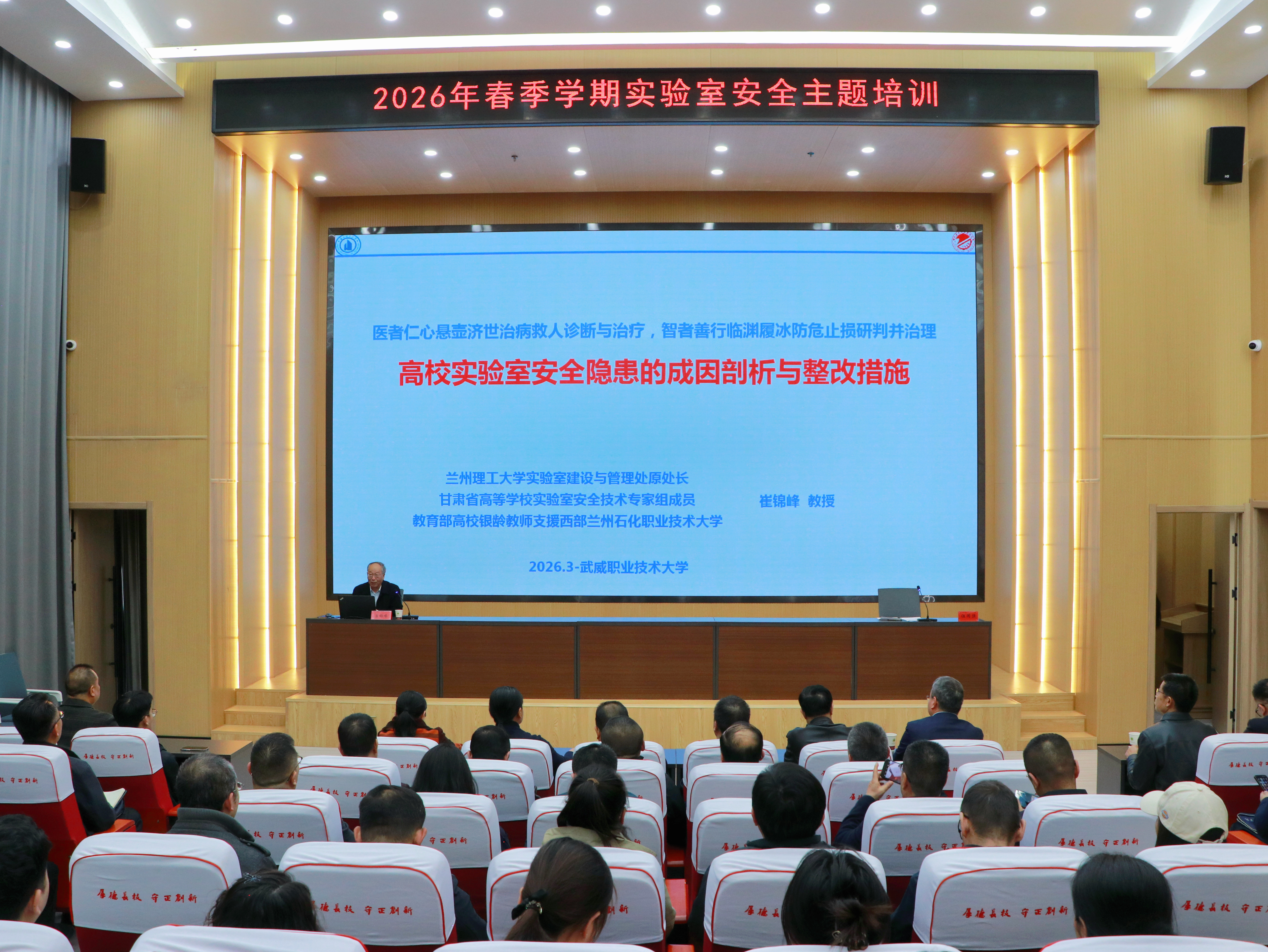 為壓實實驗室安全責任,強化全員安全紅線意識,提升實驗室安全管理水平和應急處置能力,3月11日,武威職業(yè)技術大學邀請?zhí)m州理工大學實驗室建設與管理處原處長、甘肅省高等學校實驗室安全技術專家組成員崔錦峰教授,在能源科技樓一樓學術報告廳開展2026年春季學期實驗室安全主題培訓。校領導、各部門負責人、各學院(部)黨政負責人、分管副院長、實驗室管理員及學生代表近100人參加培訓。